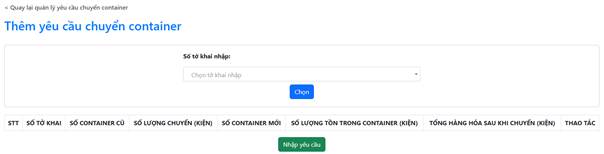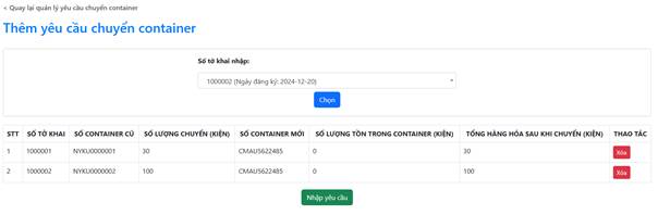 Doanh nghiệp có thể chọn nhiều tờ khai để chuyển container. Sau khi hoàn thành việc chọn, nhấn nút “Nhập yêu cầu” để thêm yêu cầu chuyển container