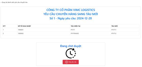Yêu cầu chuyển tàu mới thêm sẽ ở trạng thái đang chờ duyệt, doanh nghiệp có thể chọn “Hủy yêu cầu”