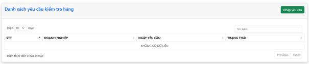 Doanh nghiệp chọn “Yêu cầu kiểm tra hàng” trong thanh điều hướng và chọn nút “Nhập yêu cầu”
