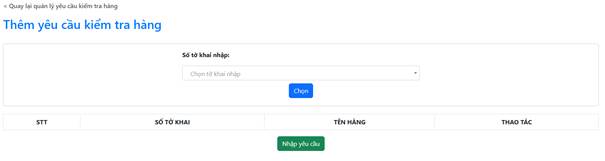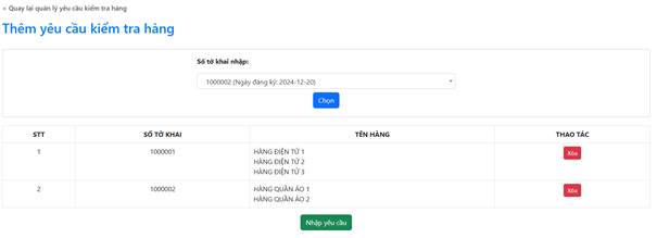 Doanh nghiệp có thể chọn nhiều tờ khai để yêu cầu kiểm tra. Sau khi hoàn thành việc chọn, nhấn nút “Nhập yêu cầu” để thêm yêu cầu kiểm tra